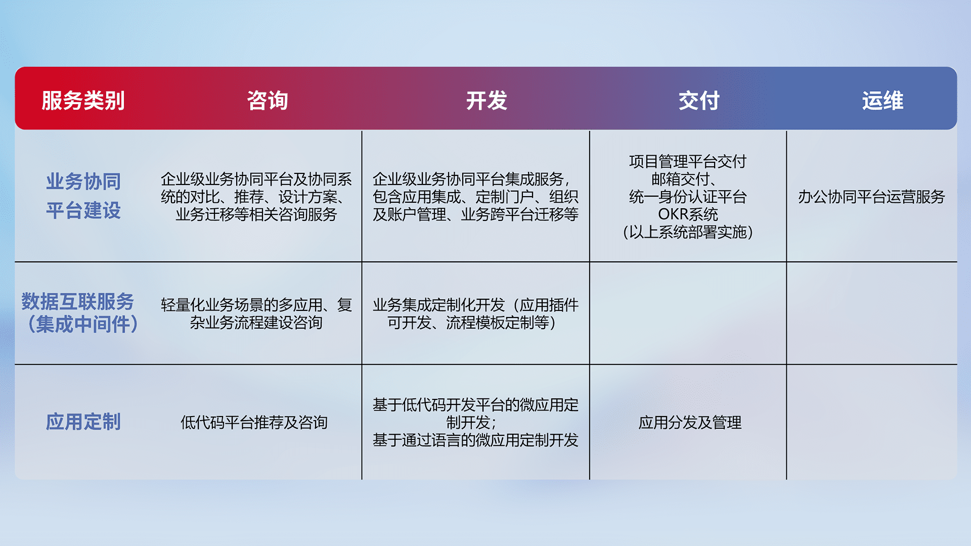 针对钉钉、、、、企微、、、、IDaas等平台级产品提供产品的规划、、、方案、、、交付、、、、定制化开发等服务,,,,实现如统一协同办公、、智能客户服务、、混合会议管理、、、智能数据查询、、、等业务场景,,,实现数字化转型。。。